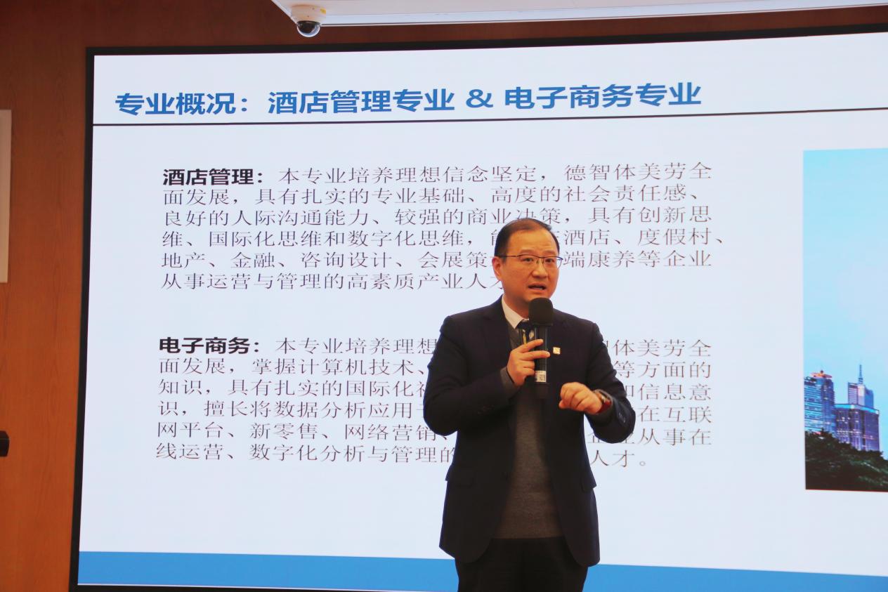 副院长席宇斌则聚焦于学生的学业成长路径。他深入解读了学院“理论-实践-再理论”螺旋式上升的课程结构。学院构建了覆盖四年的递进式实习体系,与东湖集团、锦江集团、携程集团等基石企业建立深度合作。在校期间,学生可以参与真实商业项目中,实现"学中做、做中学"的教育理念。