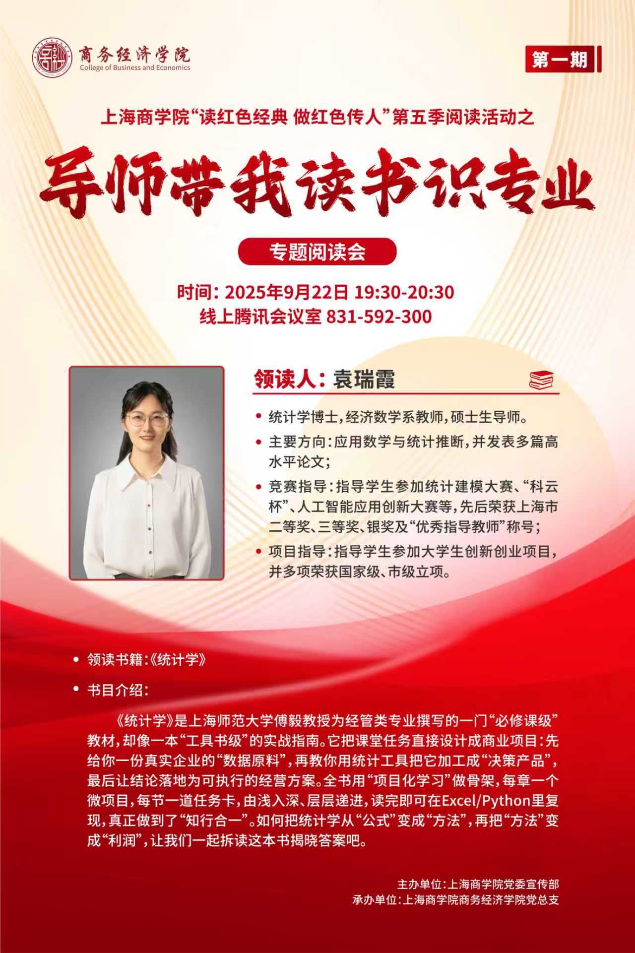 为助力 2025 级新生筑牢专业基础,9月28日晚,由上海商学院党委宣传部主办、商务经济学院党总支承办的上海商学院“读红色经典 做红色传人”第五季阅读活动之“导师带我读书识专业”专题阅读活动最后一期如约而至。经济学博士、硕士生导师、税务系专任教师束磊,为2025级新生精彩领读《中国税史》一书。本次活动由商务经济学院税务系主任刘倩主持。