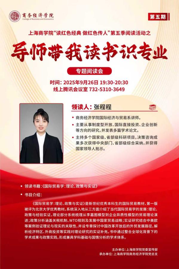 上海商学院“读红色经典 做红色传人”第五季阅读活动之“导师带我读书识专业”专题阅读活动至此已圆满落幕,此次专题阅读活动将第一课堂与第二课堂相结合,将专业教育与书香育人相结合,既是对立德树人根本任务的生动践行,也是高校在育人实践中运用鲜活载体与多元路径的积极实践。