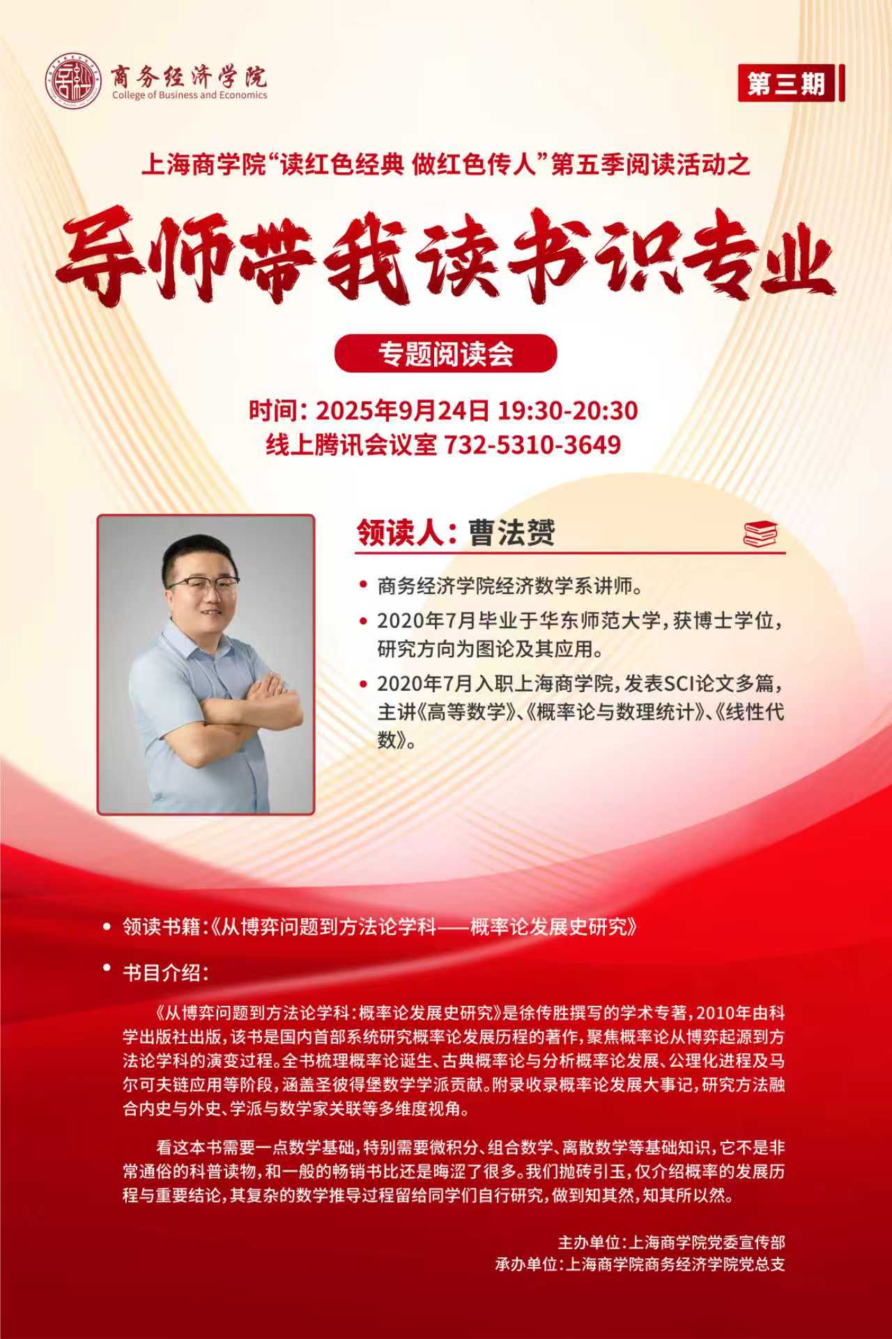 经济数学系教师、理学博士曹法赟老师领读《从博弈问题到方法论学科——概率论发展史研究》一书,梳理概率论学科的演进脉络,夯实数学基础认知,传授大学期间数学学习方法。