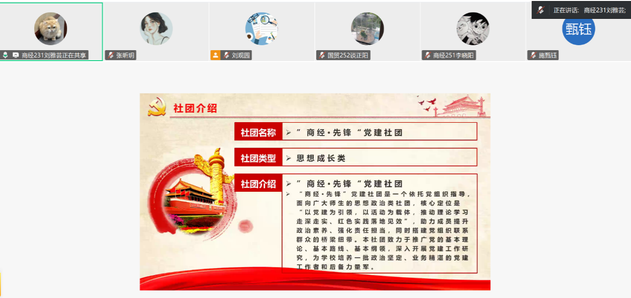 之后,学生党员、“商经・先锋” 党建社社长刘雅芸详细介绍了学院 “商经・先锋” 党建社团的组织架构与活动特色,以及 “一站式” 党员社区的建设理念与服务功能。作为党员学长,她向新生发出倡议,鼓励大家入校后主动参与社团实践,在多元化锻炼中全方位提升个人能力与综合素养。