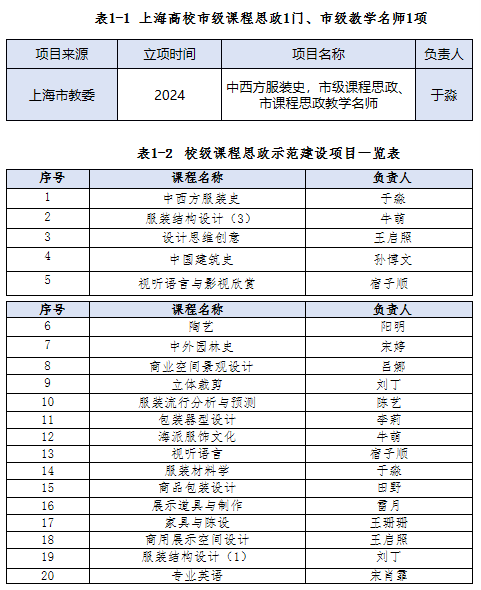 通过思想政治理论素养提升、课程思政项目申报经验分享会、课程思政集体备课等形式,强化教师课程思政育人意识,引导教师将立德树人根本任务具化到学院人才培养目标、专业培养目标和课程育人目标中,充分挖掘课程中的思政元素,在专业课程着重融入职业素养和使命担当、在实践课程侧重融入创新精神和社会责任。例如,上海市课程思政教学名师于淼副教授聚焦“艺术 思政”,深耕《中西方服装史》课程,创造性挖掘思政元素,将专业课、思政课和实践课深度融合,主持讲授课程思政专题分享会,牵头推进产教融合,打造“传承中华优秀传统文化”品牌项目,带领学生走访苏绣、云锦等非遗传承人,推动传统工艺与现代设计融合。