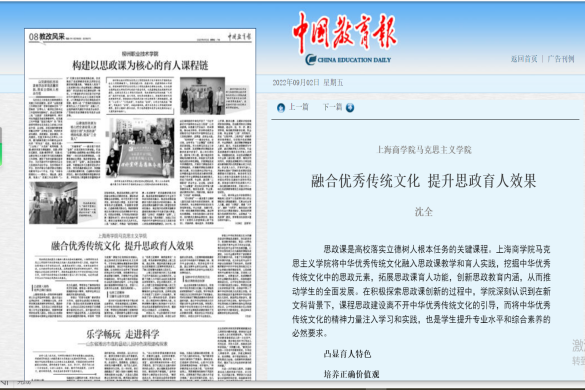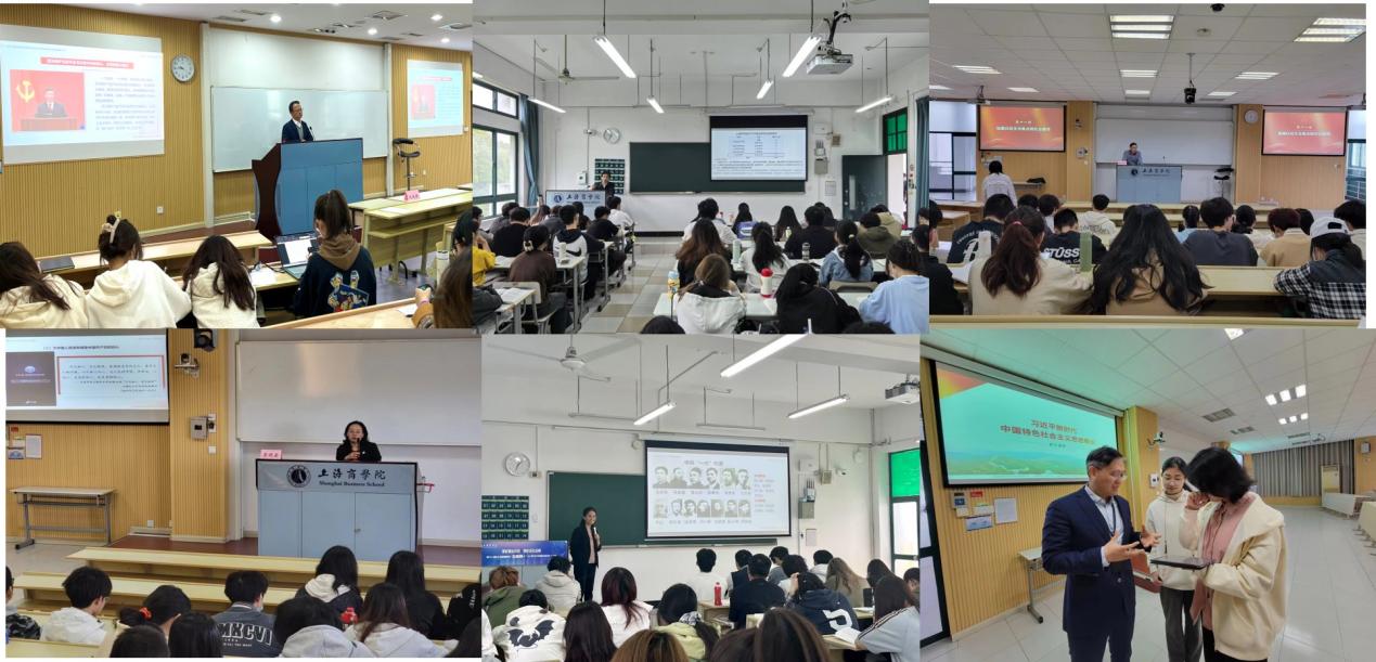 学院把为全校学生上好思政课作为第一要务,积极推动思政课教学改革创新,不断加强和改进思政课改革创新,促进思政课内涵式发展。同时以商科“大思政课”为特色,将马克思主义中国化最新成果、坚持和发展中国特色社会主义最新经验、马克思主义理论学科最新研究进展全面贯穿并有机融入思想政治理论课教育教学。学院开设了“中国系列”:《文化中国》《丝路中国》《红色中国》《商道中国》《民俗中国》《以经济学智慧解读中国》等思政课选修课。在“中国系列”课基础上,全面推动习近平总书记分领域思想专题课建设,开设有《习近平经济思想》《习近平法治思想》《大国关系与外交战略》《新发展理念社会主义政治经济学》《习近平强军思想》,推动思政课程与课程思政同向同行。3门课程获批上海高校市级重点课程,《习近平新时代中国特色社会主义思想概论》《思想道德与法治》《中国近现代史纲要》《形势与政策》获批校级一流本科课程建设项目。