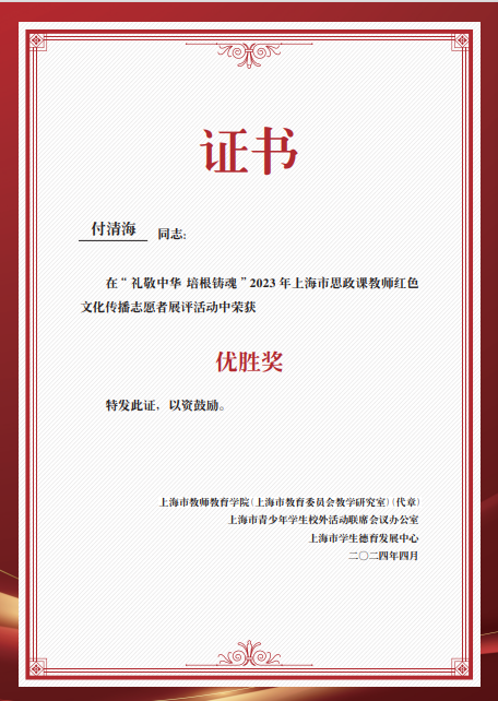 图 1. 2023年上海市思政课教师红色文化传播志愿者展评活动优胜奖证书 |