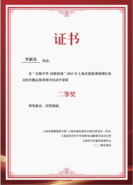 图1. 2023年上海市思政课教师红色文化传播志愿者展评活动二等奖证书 |