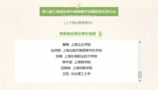 教师深耕教学研究,通过参加各级各类教学竞赛,以赛促教,以赛促学,增强思政课的思想性、理论性、针对性和亲和力。近年来,2名教师在上海市思政课教师红色文化传播志愿者展评活动中分获获二等奖和获优胜奖;1名教师在上海高校青年教师教学竞赛中获三等奖;1名教师在全国高校教师国家安全教育教学视频征集与展示活动中入围;3名教师在上海市“红色一课”展示中分获二等奖、三等奖;获批1个上海市人工智能促进科研范式改革赋能学科跃升计划;2个市级教学科研建设项目;累计获得23个校级教学改革建设项目或比赛。